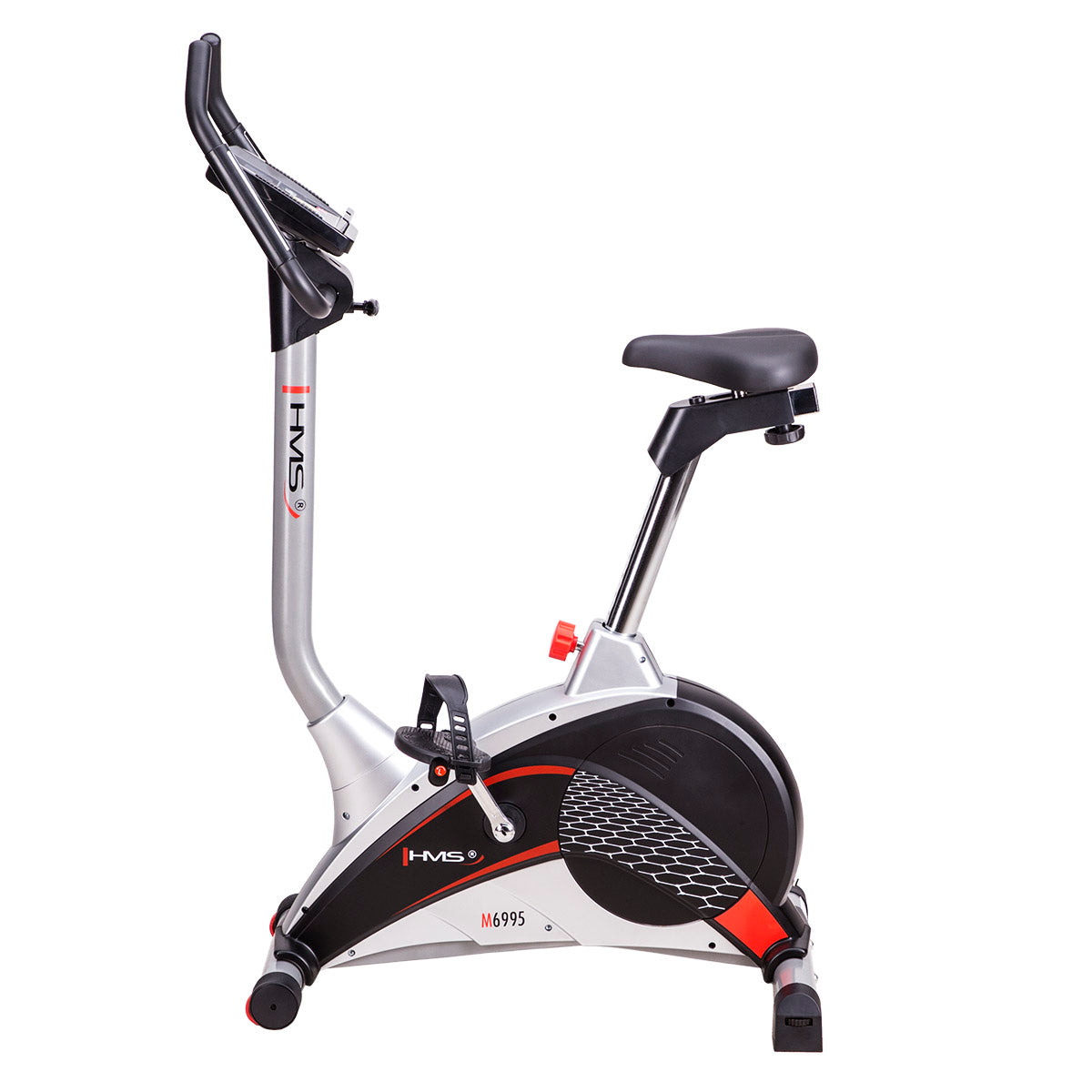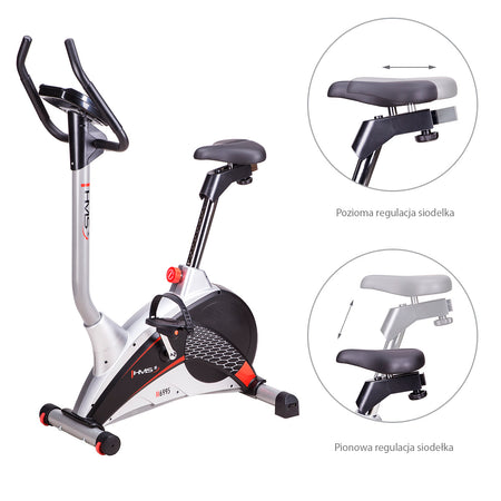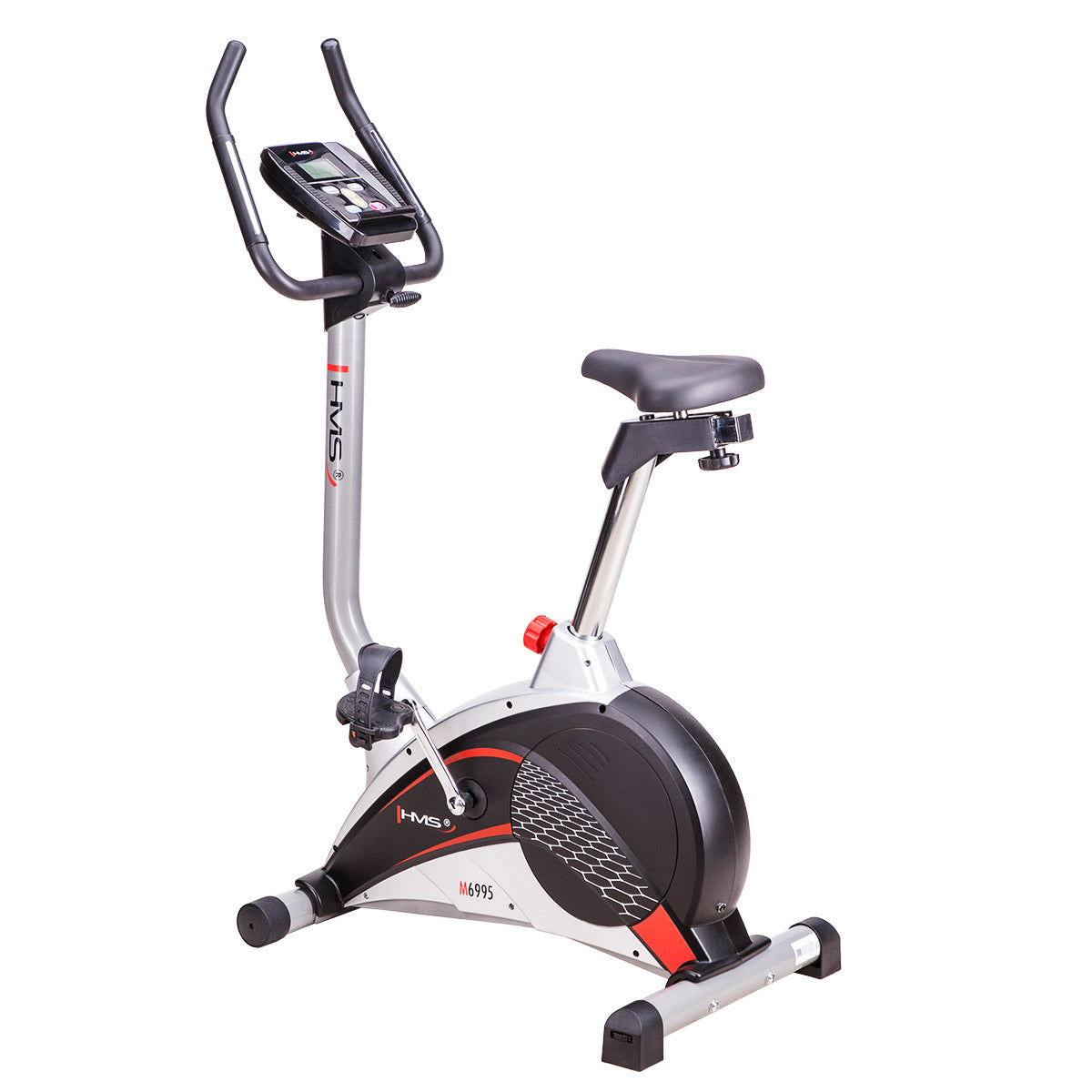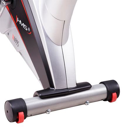 Der magnetische Heimtrainer M6995 HMS ist eine solide und stabile Konstruktion. Die Fußkappen zur Höhenverstellung werden Ihnen helfen, dieses Sportgerät problemlos aufzustellen. Der Transport des Heimtrainers wird mit den eingebauten Transporträdern einfacher. Der verstellbare Sattel sowie die bequemen Pedale mit den verstellbaren Riemen gehören zu den weiteren Vorteilen der besonders gelungenen Konstruktion.