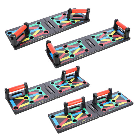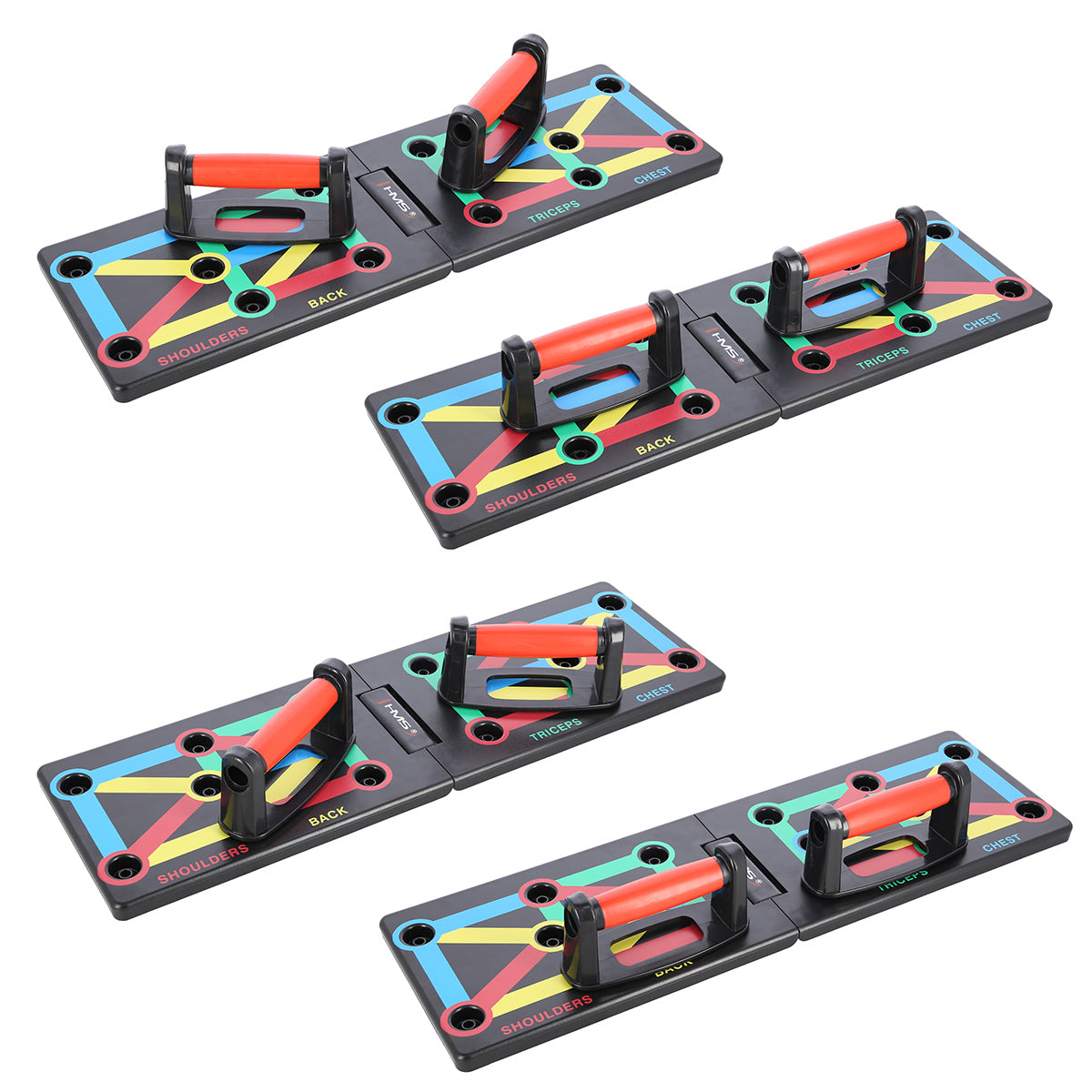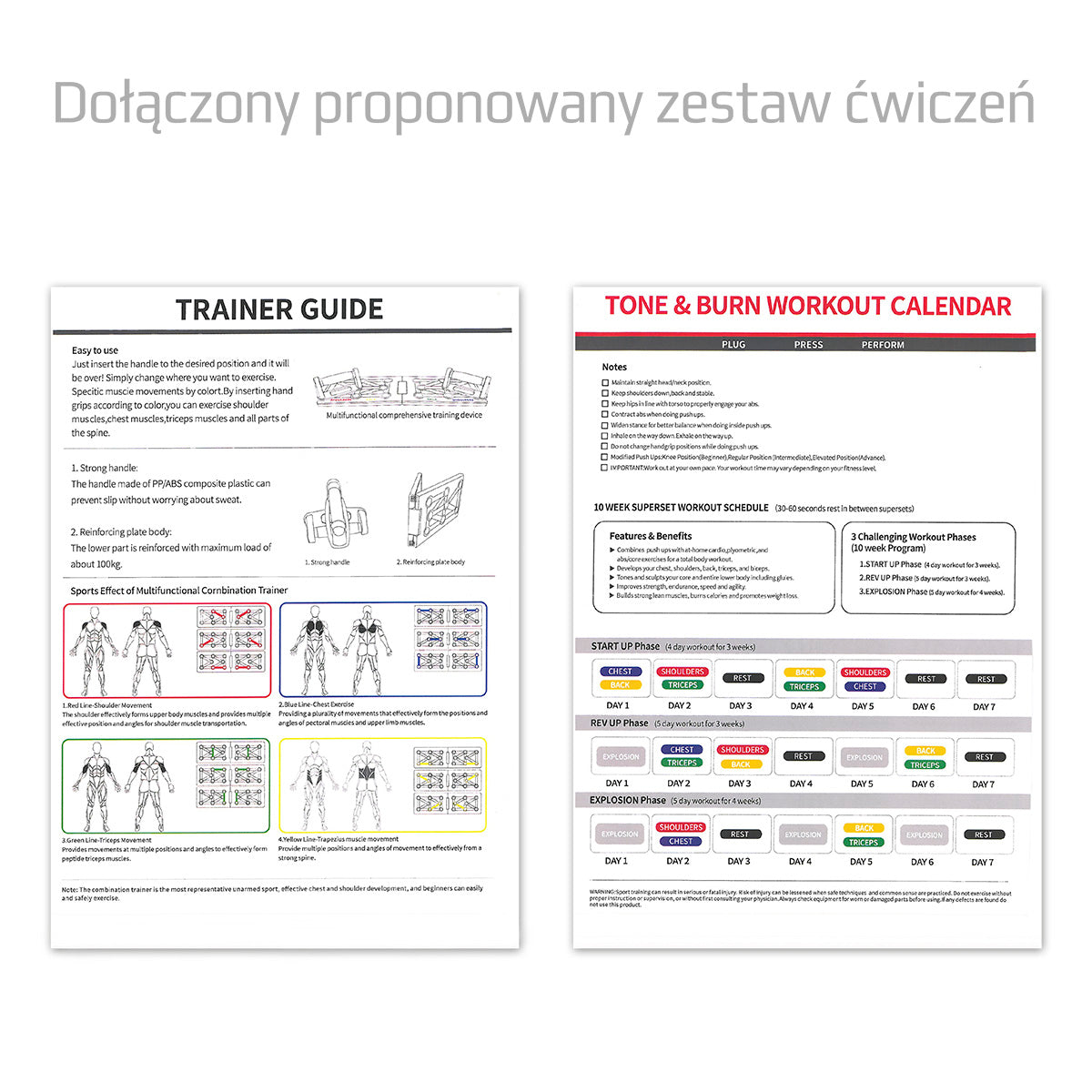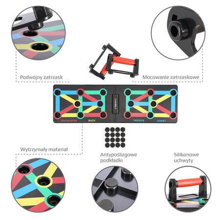 Beim Gebrauch dieses Liegestützbrettes ist es möglich, das Training des fast ganzen Oberkörperteils zu machen. Das kann man erreichen, dadurch dass man unterschiedlich die Griffe in die gewünschte Position einsteckt. Jede Änderung ermöglicht es, eine andere Muskelgruppe oder denselben Muskel aufzubauen, jedoch die Arbeit dieses Muskels sieht dann anders aus. Dadurch wird der Aufbau mehr komplex. Mit diesem Liegestützbrett können Sie Übungen für Brustmuskeln, Trizeps, Schulter- und Rückenmuskulatur machen. Jede Muskelgruppe ist auf dem Brett mit einer anderen Farbe gekennzeichnet. Die Bedeutung der Farbe ist so beschrieben, dass die Änderung der Position während des Trainings sehr schnell und einfach sein kann.