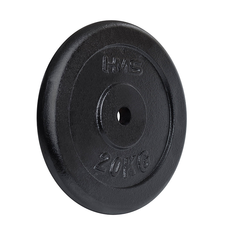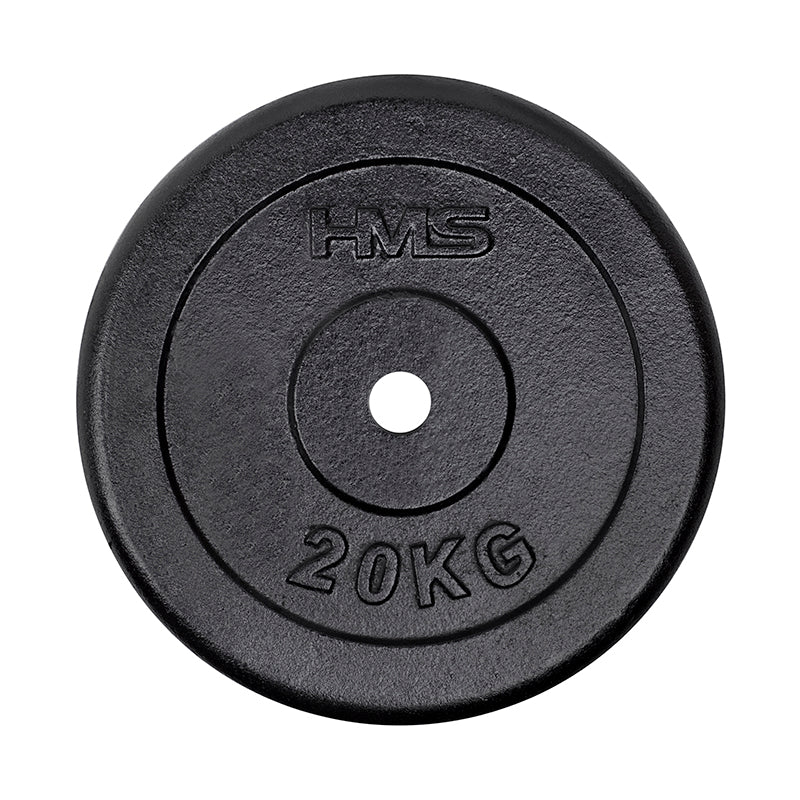 Die schwarze HMS Hantelscheibe ist in folgenden Varianten erhältlich: 1,25 kg, 2,5 kg, 5 kg, 10 kg, 15kg, 20 kg.