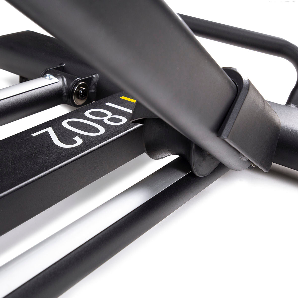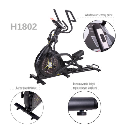 Das Modell H1802 hat eine solide Konstruktion, die sich trotz des großen Gewichts sehr einfach transportieren lässt. Dies ist dank den Transportrollen möglich. Die hochwertigsten Stoffe garantieren die Sicherheit und ermöglichen es, die Tragfähigkeit von sogar 150 kg zu erreichen. Ein weiterer Vorteil betrifft die Möglichkeit der Höhenverstellung bei Schritten. Man kann sie mit dem orangen Hebel ändern. Mit der Halterung für ein mobiles Gerät und eine Trinkflasche haben Sie alles während des Trainings dabei.