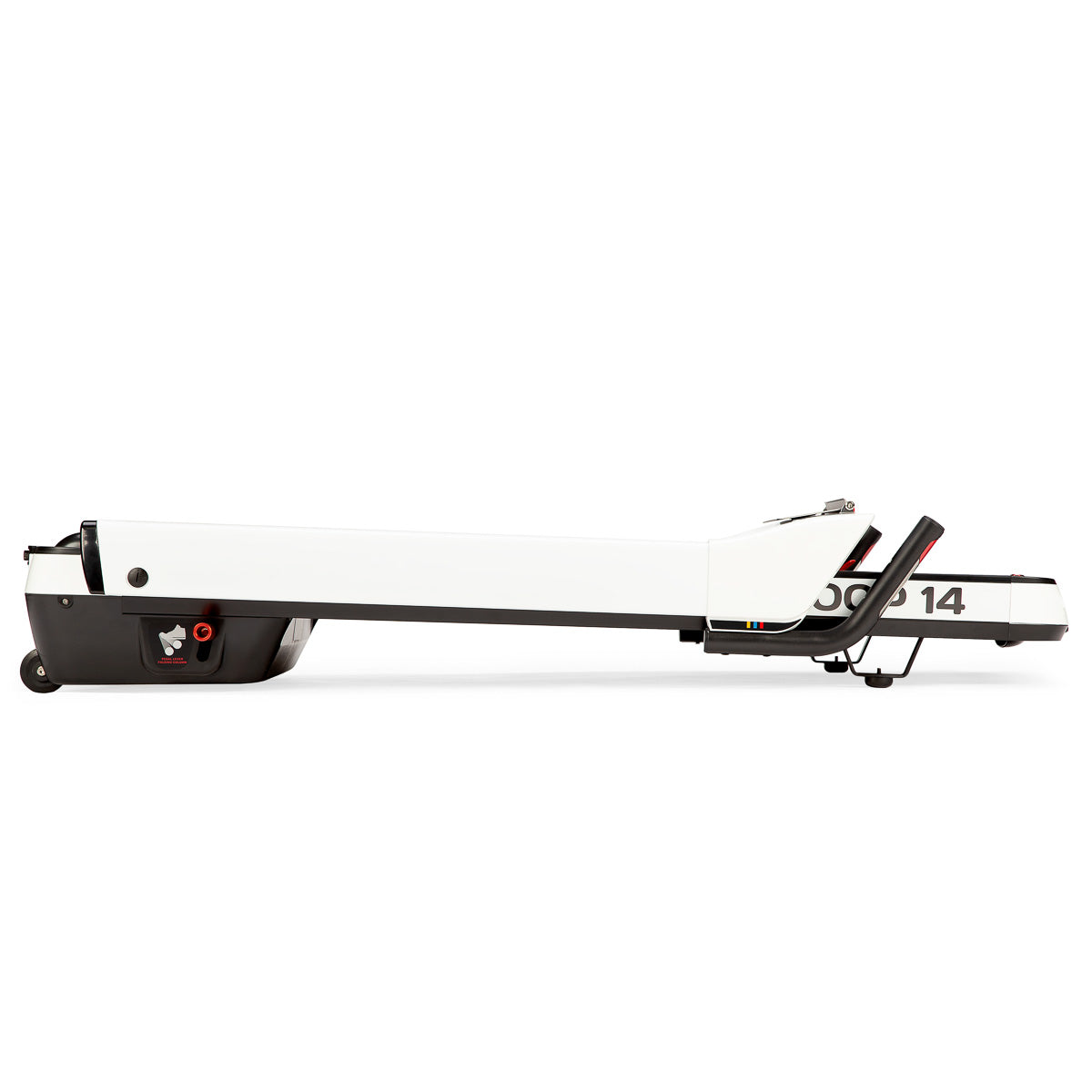 Ein weiterer Vorteil ist die Größe dieses Laufbands. Mit dem klappbaren Handlauf ist es platzsparend. Der Handlauf klappt sich spontan nach dem Lösen des Sicherungsmechanismus und dem leichten Drücken zusammen. Dieser Sicherungsmechanismus befindet sich unten des Laufbands, um ihn bequem mit dem Fußdrücken zu lösen. Die Verschiebung vom LOOP14 bereitet keine Schwierigkeiten, weil es die Transporträder hat.