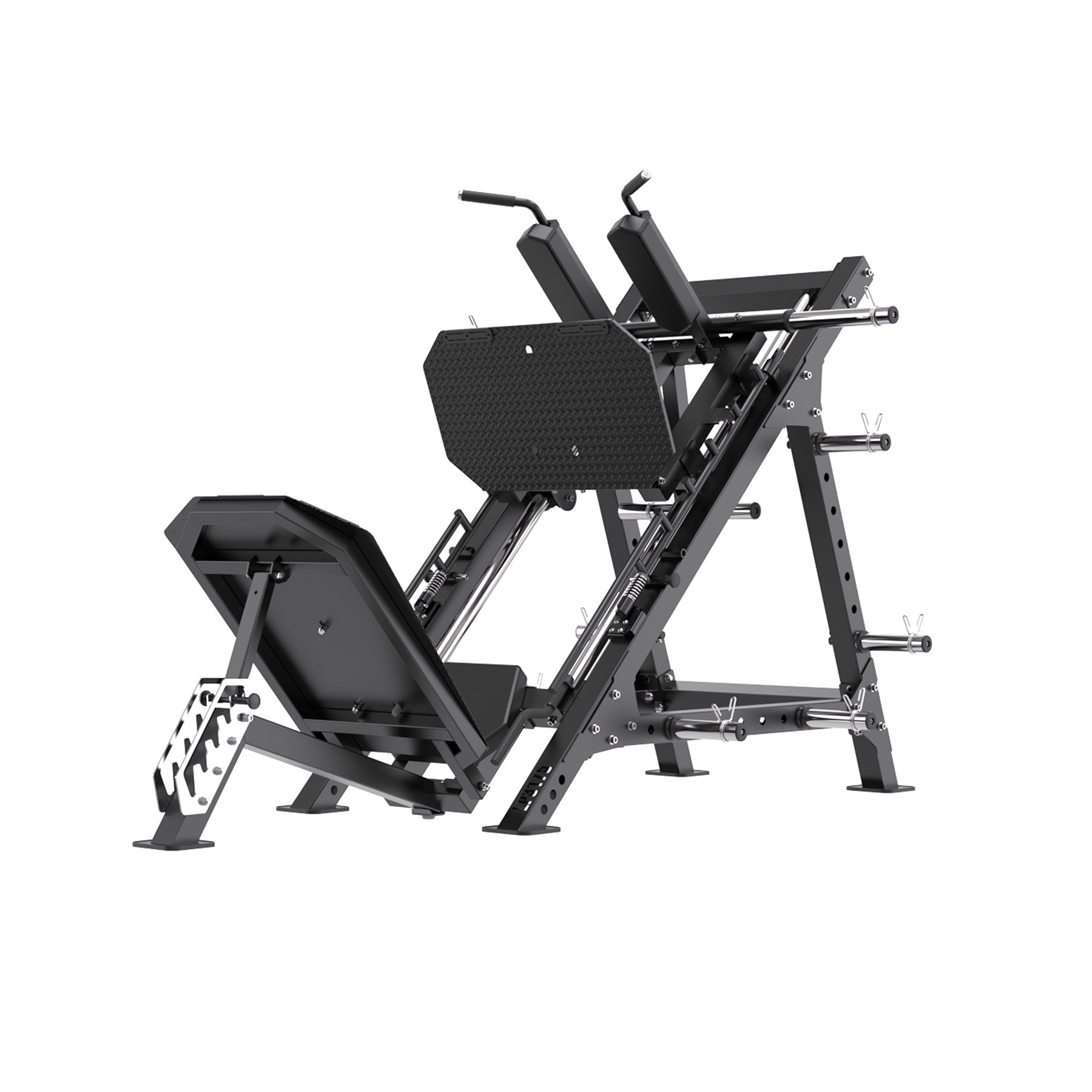 Die Beinpresse hat maximale Belastbarkeit von 450 kg. Sie können Übungen mit hoher Intensität und Progression durchführen. Die Beinpresse ist außerdem für eine Körpergröße zwischen 150 cm und 200 cm vorgesehen, sodass er für die meisten Menschen passt.