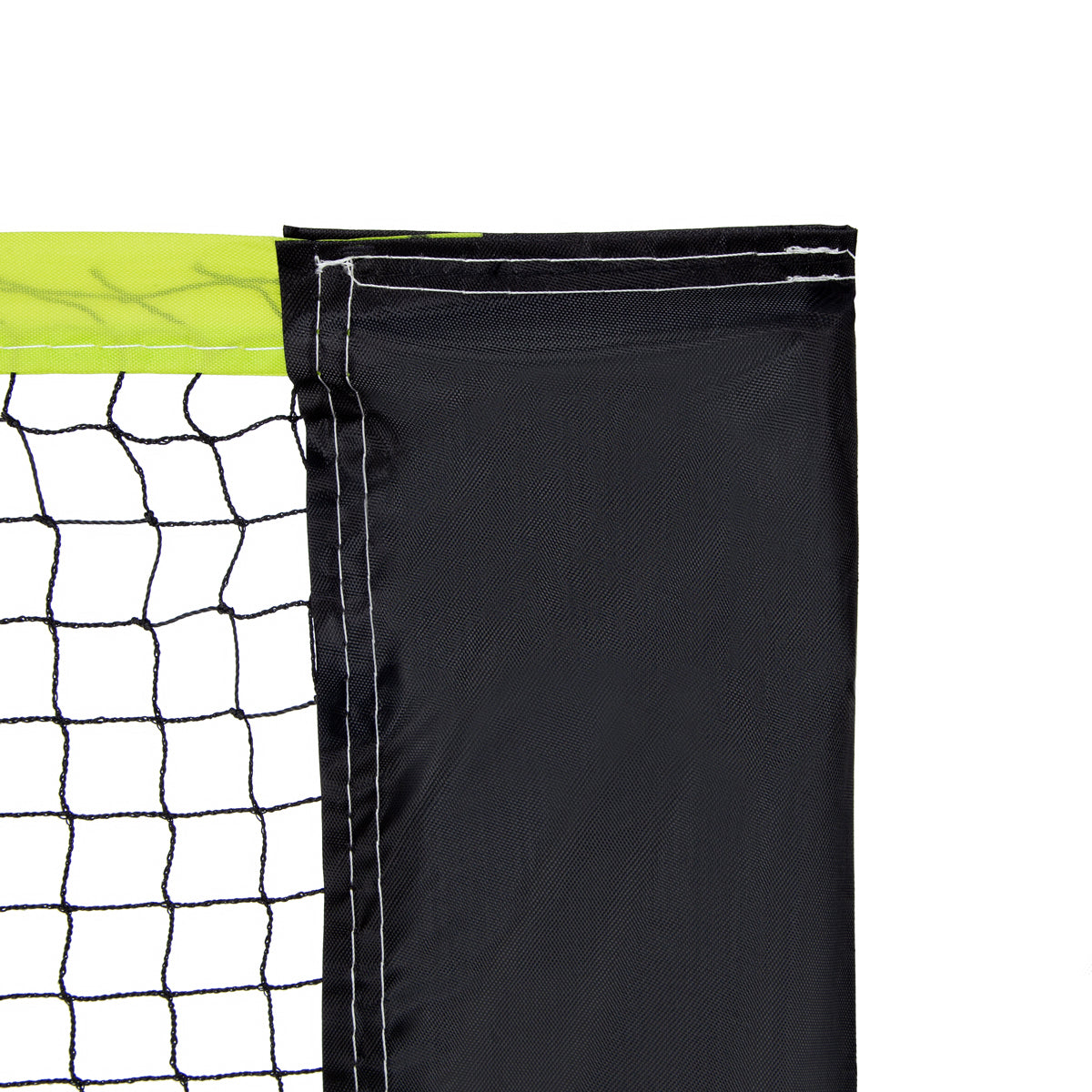 Mit dem Pfosten im mittleren Teil, der die äußeren Pfosten verbindet, ist die Konstruktion sehr stabil und robust. Das starke Netz und das solide Gestell sind wetterbeständig. Man muss es speziell nicht im Boden befestigen. Es ist freistehend, daher lässt es sich auch in einer Sporthalle benutzen.